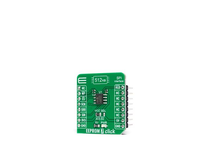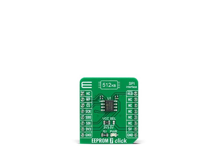 EEPROM 7 Click is based on the 25CSM04, a 4 Mb Serial EEPROM with a Serial Peripheral Interface (SPI), a 128-bit serial number, and enhanced Write Protection Mode from Microchip. The 25CSM04 is organised as 524,288 bytes of 8 bits each (512 Kbyte) and features a nonvolatile Security register independent of the 4 Mb main memory array. The first half of the Security register is read-only and contains a factory-programmed, globally unique 128-bit serial number in the first 16 bytes. It also includes a Software Device Reset function that allows the user to reset the device to its power-on default behaviour without the need to power cycle the device.