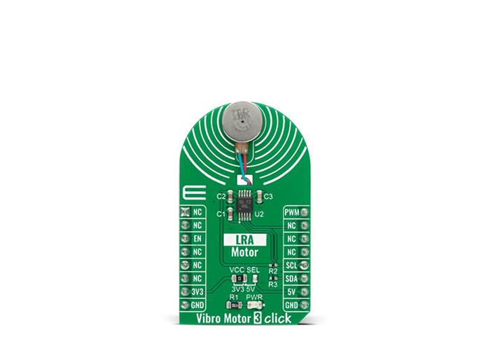 Driven by the DRV2605, a flexible Haptic/Vibra driver from Texas Instruments, this Click board™ is designed to provide extremely-flexible haptic control over a standard I2C 2-Wire interface with a maximum clock frequency of 400kHz. It possesses enabling function, routed on the CS pin of the mikroBUS™ socket labelled as the EN, and comes up with an extensive integrated library of over 100 licensed effects that eliminates the need to design haptics waveforms. It also contains a smart-loop architecture, which allows effortless auto resonant drive for LRA motor drive. This feedback provides automatic overdrive and braking, which creates a simplified input waveform paradigm as well as reliable motor control and consistent motor performance.