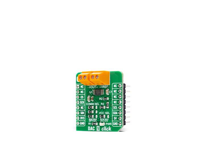 DAC 9 Click is a compact add-on board that contains a fully-featured, highly accurate digital-to-analogue converter. This board features the DAC80501, a 16-bit voltage-output digital-to-analogue converter with precision internal reference from Texas Instruments. It supports both I2C and SPI serial interface and offers a linearity of < 1 LSB. It also includes a 2.5V internal reference, giving full-scale output voltage ranges of 1.25V, 2.5V, or 5V, incorporate a Power-On Reset function, consume a low current of 1mA, and include a Power-Down feature that reduces current consumption to typically 15μA at 5V. This Click board™ is suitable for applications such as offset and gain control, VCO tuning, programmable reference, and more.