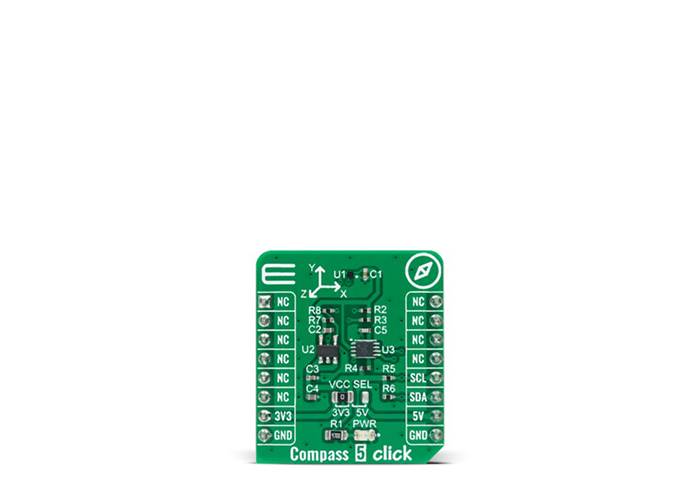Compass 5 Click is a compact add-on board that contains a 3-axis magnetometer device suitable for compass application. This board features the AK09918C, a 3-axis electronic compass with high sensitive Hall sensor technology from AKM Semiconductor.