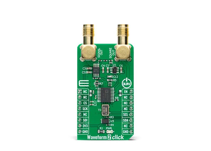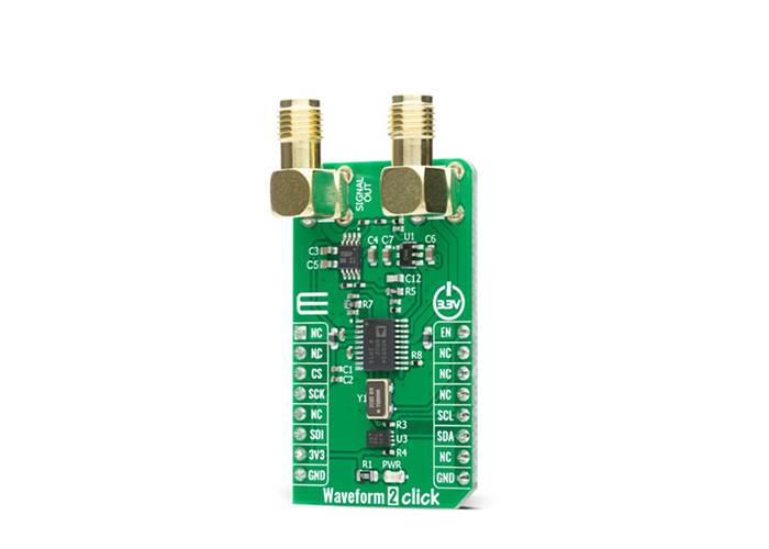 Waveform 2 Click is a compact add-on board that contains a direct digital synthesis device for waveform generator applications. This board features the AD9834, a 75 MHz low power DDS device capable of producing high-performance sine/triangle/square outputs from Analogue Devices. It provides the capability for phase and frequency modulation and has an on-board comparator that allows the production of a square wave signal for clock generation. With a 75 MHz clock rate resolution of 0.28Hz can be achieved, while similarly, with a 1 MHz clock rate an AD9834 can be tuned to 0.004Hz resolution. This Click board™ represents an ideal candidate for power-sensitive applications, frequency stimulus/waveform generation, frequency phase tuning and modulation, and many more.