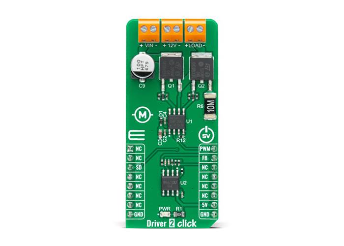 Driver 2 Click operates with the PWM signal that drives the input IN pin of the IR2104S and communicates with MCU with two other pins routed on the INT and CS pins of the mikroBUS™ socket labelled as FB and SD. This Click board™ possesses 3 connectors, where one of them represents an external power supply labelled as VIN in the range from 12 to 45V. The next one is the gate driver power supply terminal with a fixed voltage value of 12V, and the last terminal labelled as LOAD is a terminal that can supply the load with maximum current up to 10A.