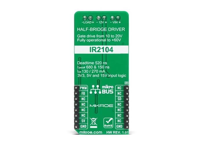 Driver 2 Click is a compact add-on board that contains a gate driver with a level-shift technology with an additional Shutdown function. This board features the IR2104S, a high voltage, high-speed power MOSFET and IGBT driver with typical 0.21 A source and 0.36 A sink currents and independent high and low side referenced output channels from Infineon Technologies. It consists of a level shifter in combination with a power amplifier that accepts a low-power input compatible with standard CMOS or LSTTL outputs and produces a high-current drive input for the gate of a high-power transistor. This Click board™ is suitable for any application ranging from DC-DC power supply for high power density and efficiency up to a wide range of motor applications.