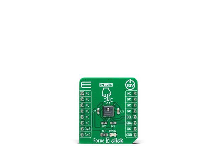 Force 5 Click is a compact add-on board that contains a stable and flexible compensated/amplified micro force sensor.