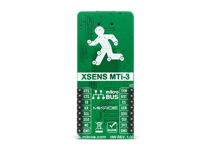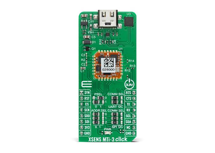 XSENS MTi-3 Click is a compact add-on board that contains a fully functional module that can be configured as an Inertial Measurement Unit, Vertical reference Unit, or even an Attitude & Heading Reference System.