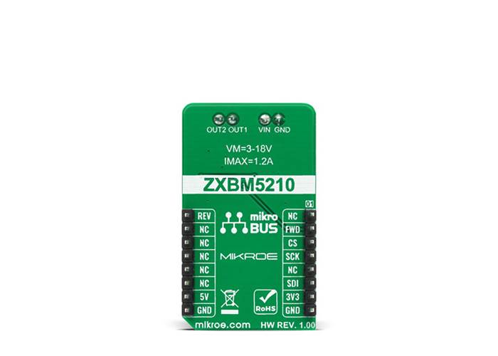 DC Motor 16 Click is based on the ZXBM5210, a single chip solution for driving a single-coil reversible direct current (DC) fans and motors from Diodes Incorporated. The driver output stage is designed to minimise audible switching noise and electromagnetic interference (EMI) ensuring a low noise solution. The device has four motor operation modes: Standby, Forward, Reverse, and Brake Mode. These four modes are controlled by the FWD and REV pins routed to the RST and PWM pins of the mikroBUS™ used for controlling the motor rotation directions. In the Standby mode, all the internal circuits are turned off to minimise power consumption, while the Brake mode allows the motor to stop quickly. The power consumption in the Standby mode is less than in the Brake mode. To prevent the ZXBM5210 from entering the Standby mode during mode changes, the signal change should be completed within 125μs.