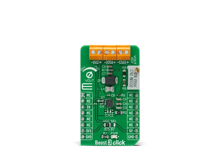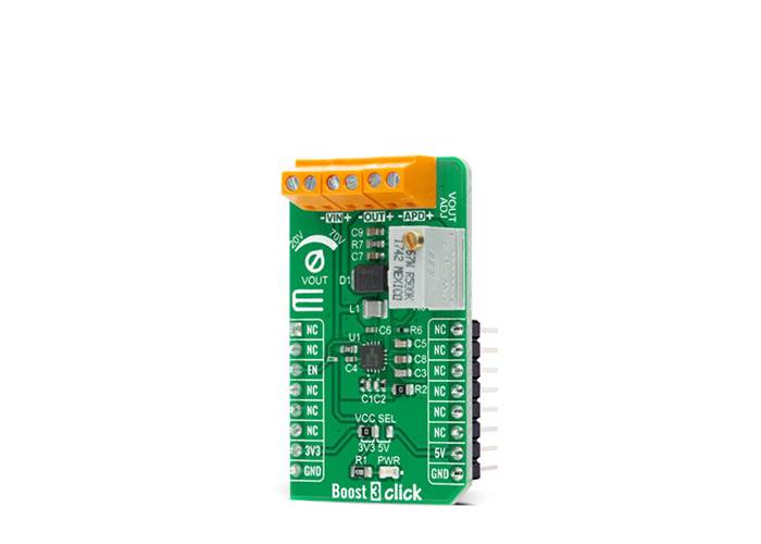 Boost 3 Click is a compact add-on board that contains a boost converter with an integrated current mirror function. This board features the TPS61391, a 700-kHz pulse-width modulating (PWM) Step-Up converter with a 70V switch FET with an input voltage up to 5.5V from Texas Instruments. The TPS61391 includes an accurate current mirror, with two selectable gain options (1:5 or 4:5), and provides high optical-power protection with an additional FET in series with the APD power path, with the typical response time of 0.5µs. This Click board™ is designed to be used for applications such as biasing and monitoring the avalanche photodiodes (APD) in the optical receivers, but it also can be used as a high voltage sensor supply or in battery-powered and automotive applications.
