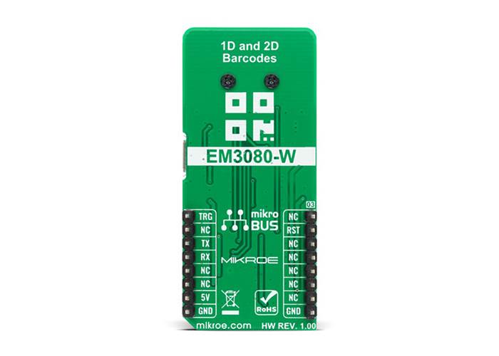 Barcode 2 Click is based on the EM3080-W, a barcode decoder chip that delivers superior performance and solid reliability with low power consumption from Newland Auto-ID Tech. Co., Ltd. This barcode scanner module is designed to quickly scan the barcode or QRcode data, and send the information either to the host MCU or the host PC. It features an excellent near-field reading, wide-viewing angle, and snappy reading, the also offers stunning performance on decoding poor-quality and damaged barcodes. The advanced technology incorporated in the EM3080-W helps reduce its power consumption and prolong its service life.