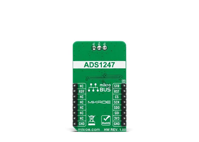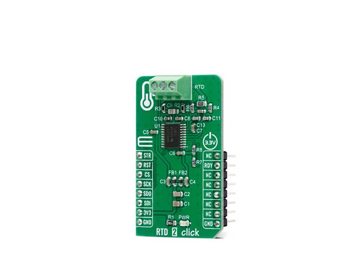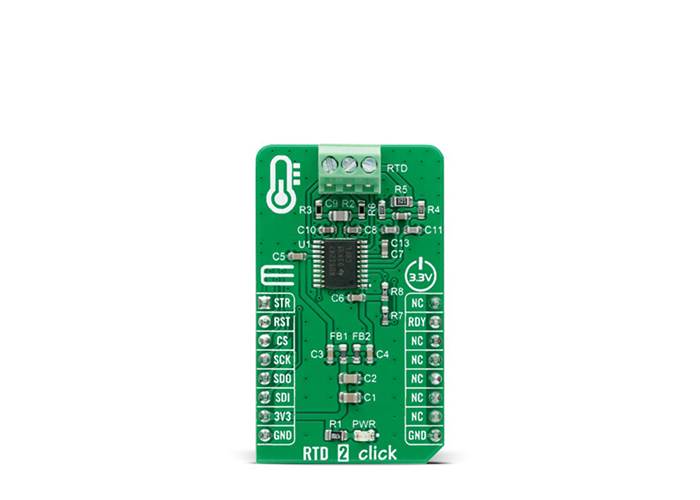 RTD 2 Click is a compact add-on board used for applications with resistive elements that change resistance over temperature. This board features the ADS1247, 24-bit analogue-to-digital converter with a programmable gain amplifier (PGA) for sensor measurement applications from Texas Instruments. It features a precision delta-sigma (ΔΣ) ADC with a single-cycle settling digital filter, and an internal oscillator, but also provides a low-drift voltage reference, and two matched programmable excitation current sources (IDACs). It also integrates sensor burn-out detection, voltage bias for thermocouples, system monitoring, and digital GPIOs. This Click board™ is suitable for temperature sensor measurements such as RTDs, thermocouples and thermistors, for pressure measurements, process control, and many more.