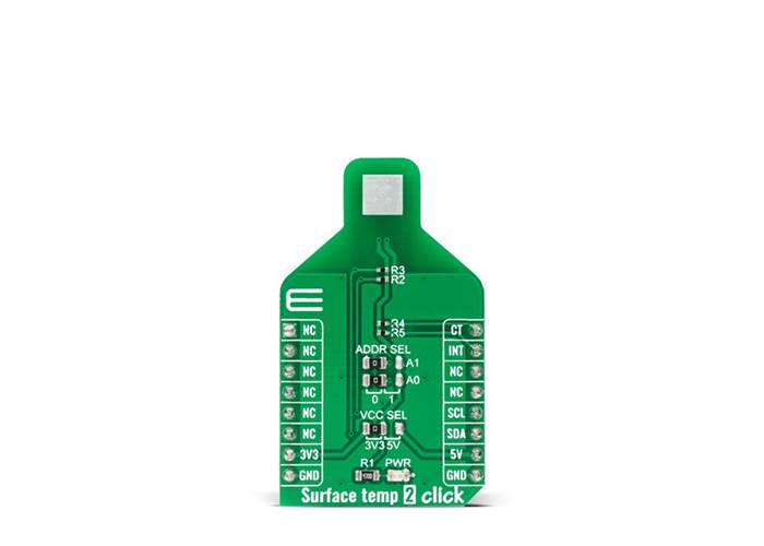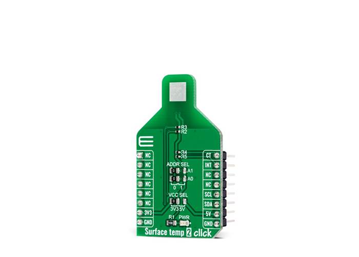 Surface temp 2 Click is a compact add-on board that contains a high accuracy temperature sensor offering breakthrough performance over a wide industrial temperature range. This board features the ADT7422, a 16-bit I2C temperature sensor from Analogue Devices. The ADT7422 features a precision ADC that provides 16-bit temperature measurement in the range of 25°C to 50°C with a resolution of 0.0078 °C and an accuracy of ± 0.1 °C. Also, it does not require additional calibration. This makes the Surface Temp Click an excellent choice for RTD and thermistor replacement, Vital Signs Monitoring (VSM), food transport and storage, environmental monitoring, HVAC, and other applications.