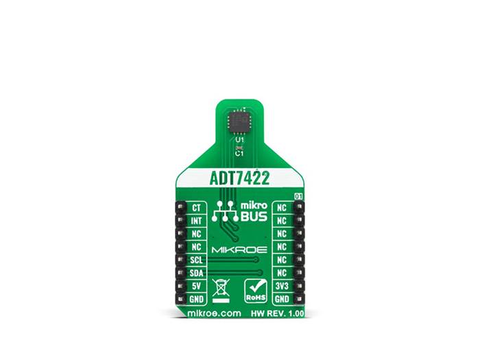 Surface temp 2 Click is based on the ADT7422, a high accuracy 16-bit digital temperature sensor with programmable interrupt and critical temperature indicator from Analogue Devices. The ADT7422 has high accuracy and linearity over the entire rated temperature range without needing correction or calibration by the user. Operating at 3.3 V, the average supply current is typically 210 μA. The ADT7420 has a shutdown mode that powers down the device and offers a shutdown current of typically 2.0 μA at 3.3 V. The ADT7422 Digital Temperature Sensor is designed to meet the ASTM E1112 standard of clinical thermometry specification. This sensor is used in applications such as Vital Signs Monitoring (VSM), medical equipment, thermocouple cold junction compensation, and laser diode temperature control.