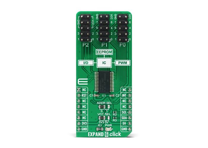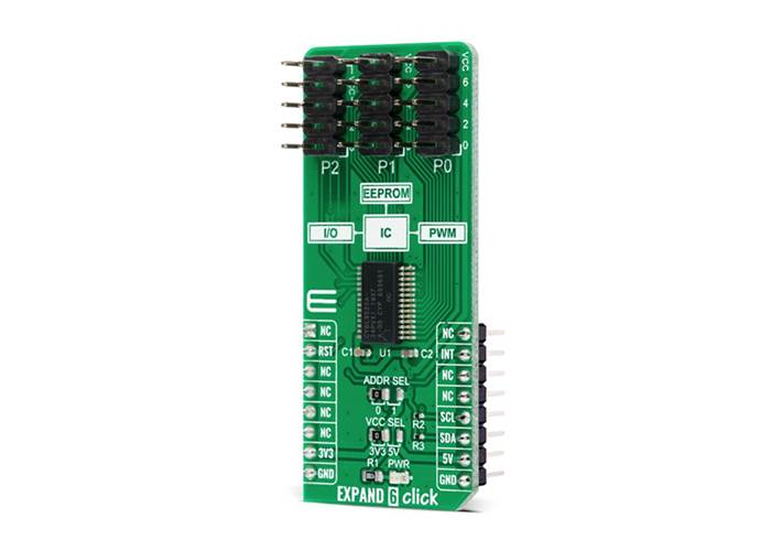 EXPAND 6 Click is a compact add-on board that contains an I2C configurable multi-port I/O expander with independently configurable pins as bi-directional input/outputs or PWM outputs.
