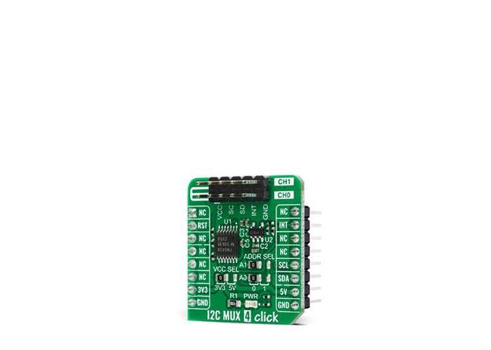 I2C MUX 4 Click is based on the TCA9543APWR, a 2-channel, bidirectional translating I2C switch from Texas Instruments. The controller SCL/SDA signal pair is directed to two channels of peripheral devices SC0/SD0 - SC1/SD1 where either individual channel or both channels can be selected determined by the programmable control register. The TCA9543APWR supports interrupt signals for the controller to detect an interrupt that can result from any of the peripheral devices connected to the interrupt pins on the output I2C channel header. It features I2C control using a single 8-bit control register in which bits 1 and 0 control the enabling and disabling of the two switch channels of I2C data flow, it supports a reset function, hot insertion, and has all switch channels deselected during Power-Up.