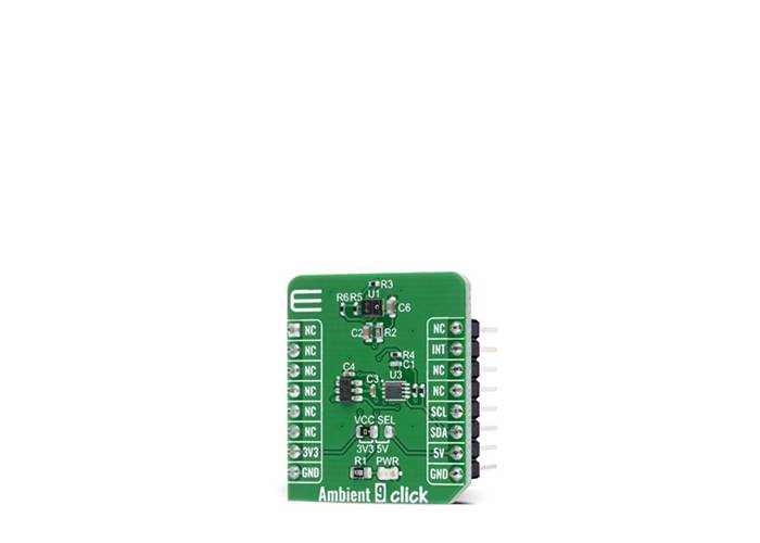 Ambient 9 Click is a compact add-on board that contains an integrated ambient light sensing and proximity detector with IR LED in an optical module. This board features the APDS-9160-003, digital ALS, and IR sensing, an IR LED, and a complete proximity sensing solution from Broadcom Limited, that is fit to be used under a small aperture of the devices cover windows. It has a wide dynamic range, the proximity detection feature operates well from bright sunlight to dark rooms, and both the PS and ALS functions independently provides maximum flexibility in applications. This Click board™ is fitting for display management to extend battery life and provide optimum viewing in diverse lighting conditions.