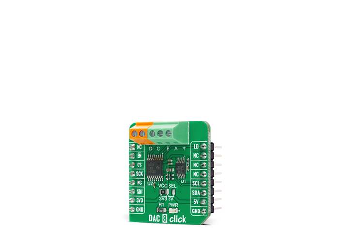 DAC 8 Click is a compact add-on board that contains a fully-featured, general-purpose voltage-output digital-to-analogue converter. This board features the DAC8554IPWR, a 16-bit QUAD channel voltage-output digital to analogue converter from Texas Instruments.