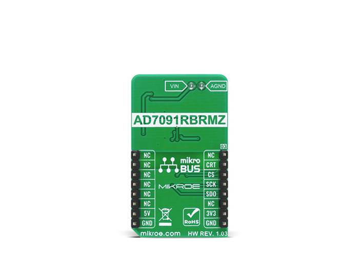 This Click board™ uses the SPI communication interface with both 3.3V and 5V. The onboard SMD jumper labelled as VCC SEL allows voltage selection for interfacing with both 3.3V and 5V MCUs. More information about the AD7091R’s functionality, electrical specifications, and typical performance can be found in the attached datasheet. However, the Click board™ comes equipped with a library that contains easy to use functions and a usage example that may be used as a reference for the development.