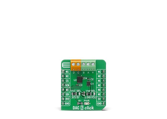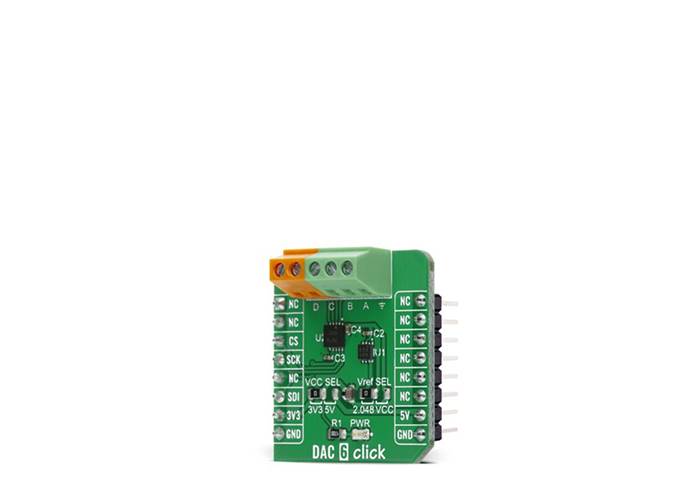 This Click board™ uses the SPI communication interface with both 3.3V and 5V. The onboard SMD jumper labelled as VCC SEL allows voltage selection for interfacing with both 3.3V and 5V MCUs. More information about the DAC104S085’s functionality, electrical specifications, and typical performance can be found in the attached datasheet. However, the Click board™ comes equipped with a library that contains easy to use functions and a usage example that may be used as a reference for the development.