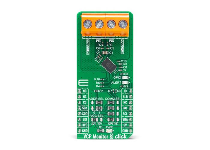 VCP Monitor 3 Click is a high precision Voltage, Current and Power measurement Click board™ with an input capable of taking up to 15V. It features the LTC2947, from Analogue Devices, a high precision power and energy monitor with an internal sense resistor supporting up to ±30A. Three internal no latency delta-sigma ADCs ensure accurate measurement of voltage and current, with up to 0.5% voltage and 1% current accuracy while high-bandwidth analogue multiplication provides precise power measurement in a wide range of applications. An internal 300μΩ, temperature-compensated sense resistor minimizes efficiency loss while enabling high accuracy current measurement over the full temperature range. All measured values are stored in internal registers accessible via the selectable I2C or SPI interface. All these features make VCP Monitor 3 Click ideal for using in applications such as industrial measurements, electric vehicles, photovoltaic systems, telecom infrastructure, servers, and more.