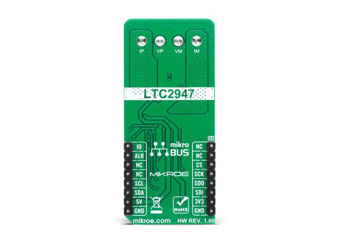 Measuring a total of seven parameters: current, voltage, power, charge (coulombs), energy, and run time, as well as its own chip temperature, makes this Click board™ excellent for high variety of applications. Main chip LTC2947 includes three no latency delta-sigma analogue-to-digital converters to simultaneously measure current, voltage, and power. It also measures die temperature and derives the accumulated quantities charge, energy, and time using an on-board oscillator. It stores these values in internal registers that can be read out via the serial interface, configurable as either I2C or SPI. The LTC2947 keeps track of the minimum and maximum measured values for each of the measured quantities. Thresholds can be set for each parameter, and the LTC2947 will set the corresponding bit in the Alert register and optionally alert the host by pulling low on the ALERT pin when a threshold is exceeded. A GPIO pin is included that can be used for four different purposes. It can be configured as a general-purpose-logic input or output, as an output to automatically control a fan based on the LTC2947’s internal silicon temperature measurement or as an input to enable and disable accumulation of charge, energy, and time.