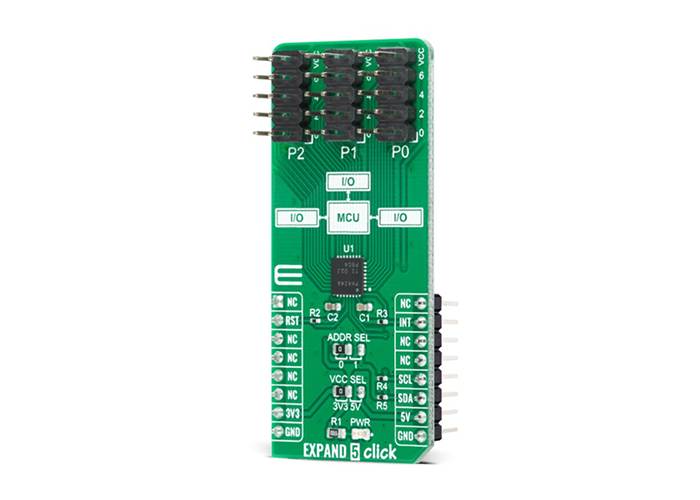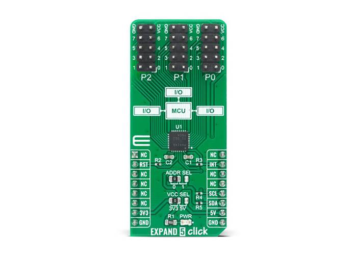 EXPAND 5 Click features a low-voltage 24-bit I2C and SMBus I/O expander. This 24-bit I/O expander is designed to provide general-purpose remote I/O expansion for most microcontroller families via the I2C serial interface.
