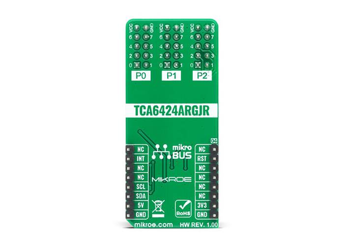 This Click board™ can be supplied and interfaced with both 3.3V and 5V without the need for any external components. The onboard SMD jumper labelled as VCC SEL allows voltage selection for interfacing with both 3.3V and 5V microcontrollers. More information about the TCA6424A can be found in the attached datasheet. However, this Click board™ comes equipped with a library that contains easy to use functions and a usage example that may be used as a reference for the development.