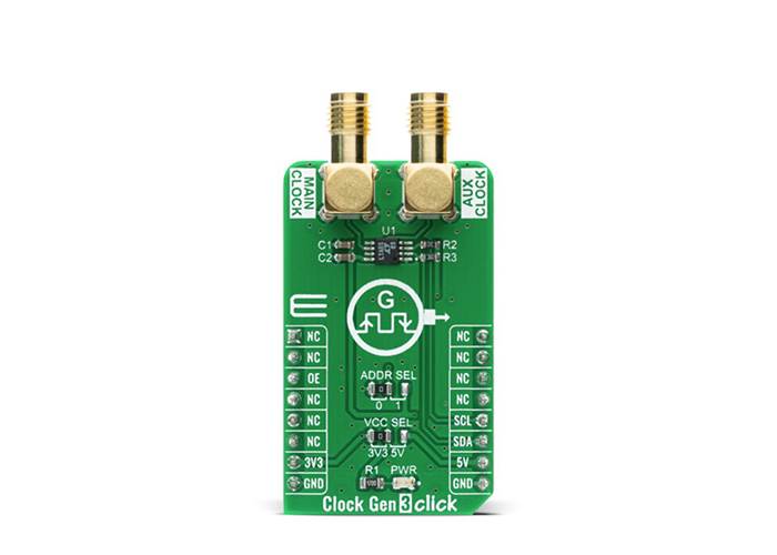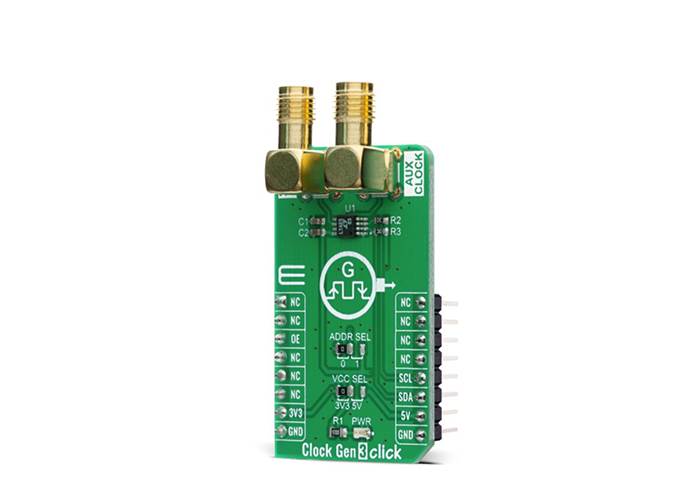Clock Gen 3 Click features a low power self-contained digital frequency source providing a precision frequency from 1kHz to 68MHz, set through a serial port. This Click board™, an I2C configurable clock generator, features the LTC6904 from Analogue Devices and requires no external components other than a power supply bypass capacitor, and it operates over a single wide supply voltage range of 2.7V to 5.5V. The LTC6904 features a proprietary feedback loop that linearizes the relationship between digital control settings and frequency. It has many features that make it attractive for various applications such as a microcontroller clock source, clock source for a switched capacitor filter, or general replacement for a DAC/VCO combination.