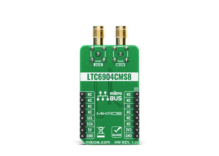 This Click board™ can be supplied and interfaced with both 3.3V and 5V without the need for any external components. The onboard SMD jumper labelled as VCC SEL allows voltage selection for interfacing with both 3.3V and 5V microcontrollers. More information about the LTC6904 can be found in the attached datasheet. However, this Click board™ comes equipped with a library that contains easy to use functions and an example that may be used as a reference for development.