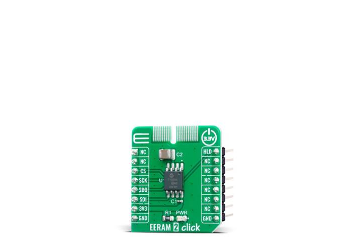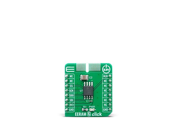EERAM 2 Click is a standalone serial SRAM memory that includes shadow non-volatile backup. EERAM uses a small external capacitor to provide the energy needed to move the contents of the SRAM to the non-volatile cells when system power is lost. Unlike NVSRAM, no external battery is needed. EERAM offers unlimited SRAM read and write cycles and more than 100,000 backups to the non-volatile cells. Since power loss events are typically random or unpredictable, EERAM works in applications that absolutely cannot lose the quickly changing SRAM data on any sudden power loss. It provides designers of a data logging/black box or monitoring systems with a safe and accurate way to safely, reliably and automatically store the last data bytes prior to the power loss event. The Vcc is monitored inside the IC and can automatically handle the data movement between the SRAM and the non-volatile memory on any power disruption.