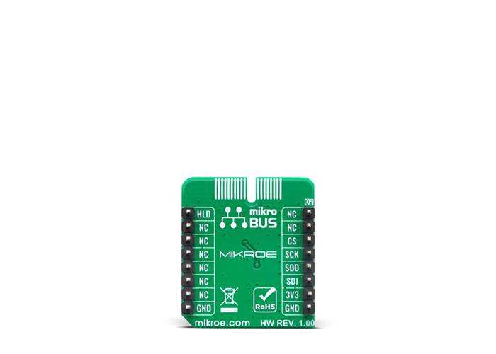 This Click board™ uses the SPI communication interface and is designed to be operated only with a 3.3V logic level. A proper logic voltage level conversion should be performed before the Click board™ is used with MCUs with different logic levels.
