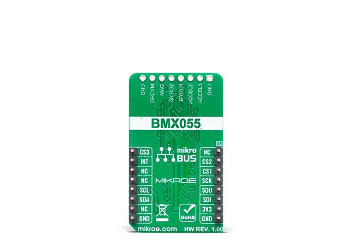 9DOF 3 Click introduces the BMX055, a small-scale absolute orientation sensor in the class of low-noise 9-axis measurement units, from Bosch Sensortec. It comprises the full functionality of a triaxial, low-g acceleration sensor, a triaxial angular rate sensor and a triaxial geomagnetic sensor. All three sensor components of the BMX055 can be operated and addressed independently from each other. On top, the BMX055 integrates a multitude of features that facilitate its use especially in the area of motion detection applications, such as device orientation measurement, gaming, HMI or menu browser control. 9DOF 3 Click offers both SPI and I2C digital interfaces for easy and fast system integration.