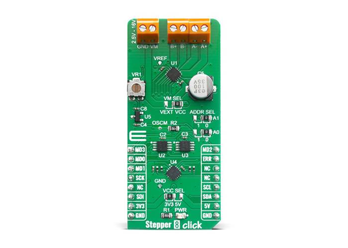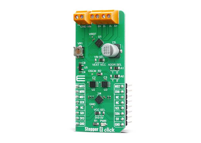 Stepper 8 Click can operate a bipolar stepper motor in full, half, quarter, 1/8, 1/16, 1/32, 1/64, 1/128 step operation. Thanks to internal safety features, such as thermal shutdown (TSD), over current (ISD), motor load open (OPD) and under voltage lockout(UVLO), this Click board™ is perfectly suited for rapid development of various stepper motor applications.