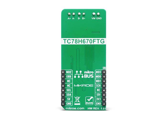 Stepper 8 Click is a motor control add on board based on TC78H670FTG from Toshiba, a clock-in and serial controlled Bipolar Stepping Motor Driver which can drive a 128 micro-stepping motor with a power supply ranging from 2.5V to 16V for wide range of applications includes USB-powered, battery-powered, and standard 9-12V system devices. A perfect solution for driving stepper motors in security cameras, portable printers, handheld scanners, pico-projectors, smartphones and many more.