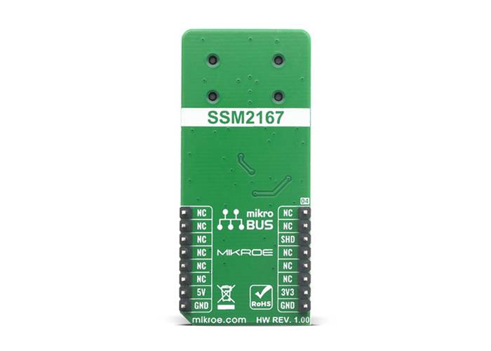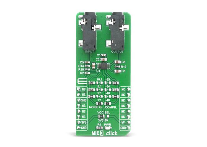 The MIC 3 Click is a Click board™ that features the SSM2167-1RMZ-R7, a Microphone Preamplifier, from Analogue Device. This Click board™ is a low voltage Microphone preamplifier with Variable compression and noise gating. The MIC 3 Click is a very easy solution to work with it, which makes it an ideal solution for using it in desktop, portable or palmtop computers, telephone conferencing, communication headsets, two-way communication, surveillance system where the microphone is needed, stethoscope, karaoke and DJ mixers.