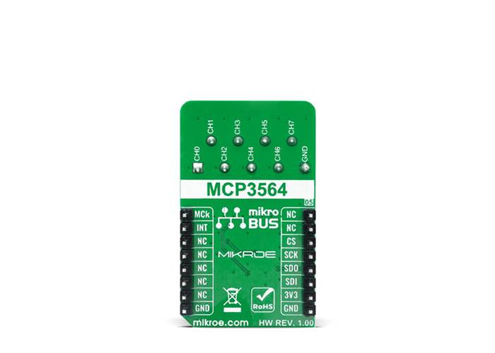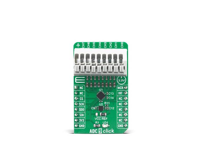 ADC 9 Click is 8th channel analogue to digital converter expansion board, for projects where you have demand for multi channel ADC conversion such as microcontrollers with small number or none analogue inputs. This Click board™ is based on MCP3564 a 24-bit Delta-Sigma Analogue-to-Digital Converter with programmable data rate of up to 153.6 ksps from Microchip. It offers integrated features, such as internal oscillator, temperature sensor and burnout sensor detection, in order to reduce system component count and total solution cost. Ideal choice for precision dana acquisition systems, high resolution data converters, industrial control, battery-powered devices and many more.