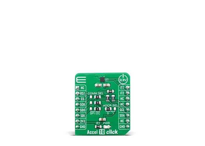 Accel 10 Click features an ultra-low power triaxial "femto" accelerometer sensor with embedded intelligence, labelled as the LIS2DW12TR. This Click board™ allows linear motion and gravitational force measurements in ranges of ±2 g, ±4 g, ±8, and ±16 g in three perpendicular axes. This smart sensor allows the Accel 10 Click to detect many different events, including tap, double tap, free-fall detection, and more, making it well suited for using it in handheld or wearable devices. It features an onboard data processing, offering the acceleration data directly, over the standard I2C or SPI interface.