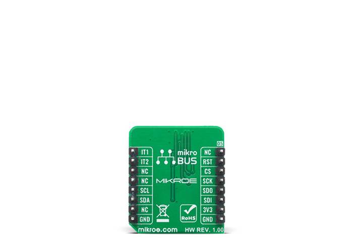 Interrupts can be triggered for many different events. Some basic events include the data-ready interrupt event and aforementioned FIFO events, while so-called feature engines can trigger an interrupt for any of the detected motion/movement events, including step detection/counter, activity recognition, tilt on wrist, tap/double tap, any/no motion, and error event interrupt. The extensive interrupt engine can use two programmable interrupt pins. Both of these pins can be assigned with any interrupt source and can be either LOW or HIGH on interrupt, depending on settings in appropriate registers. These two pins are routed to PWM and INT pin of the mikroBUS™, and are labelled as IT1 and IT2, respectively.