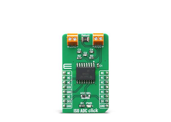 The ISO ADC Click is add-on board current-shunt measurement device with isolated delta-sigma modulator. This Click board™ is based on AMC1204BDWR provide a single-chip solution for measuring the small signal of a shunt resistor across an isolated barrier from Texas Instruments. ISO ADC Click contains shunt resistor, these types of resistors are typically used to sense currents in motor control inverters, green energy generation systems, and other industrial applications.