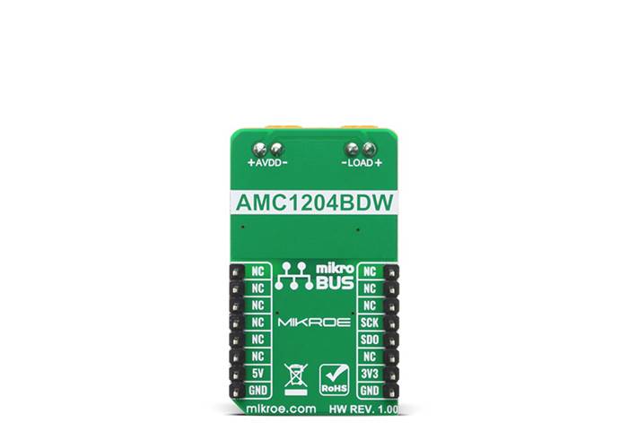 The ISO ADC Click is current sensing system, which includes isolated delta-sigma modulator. The main IC on the ISO ADC Click is AMC1204BDWR, from Texas Instruments.The current-sensing shunt resistor is designed as a 4 wire connected resistor that enables accurate measurements through a force-sense connection. The AMC1204BDWR differential inputs easily connect to the shunt resistor, An internal reference eliminates the need for external components.