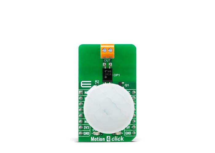 Motion 4 Click is a long distance PaPIR's motion sensor with plastic lens and controllable output. This Click board™ features EKMC1603111, a PIR motion sensor from Panasonic Corporation which can be used as human motion detector and is able to detect movement up to 12m with 170uA current consumpt...