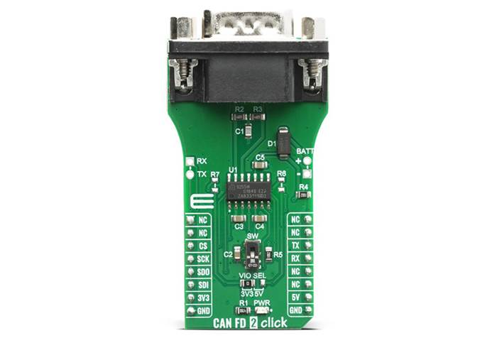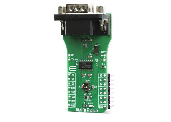 Given all the features its components offer, the CAN FD 2 Click is best used for HS CAN networks in automotive applications and HS CAN networks in industrial applications. The onboard SMD jumper labelled as the VIO SEL is used to select which voltage rail will be used as the logic voltage level. It offers voltage selection between 3.3V and 5V so that the Click board™ can be interfaced with both the 3.3V and 5V capable MCUs. The two UART wires (RX and TX) can also be connected directly through two pins to UART External Pads on the left edge of the board. With R6 and R7 jumpers populated alows you to use Click board™ with standard 12V battery connected on Battery Pads at right side of board.
