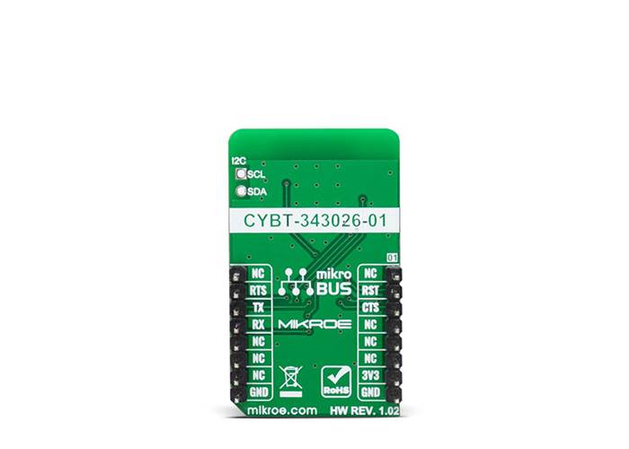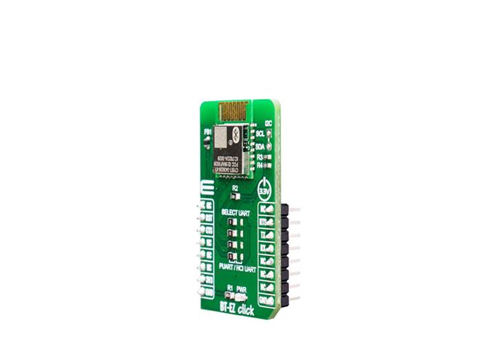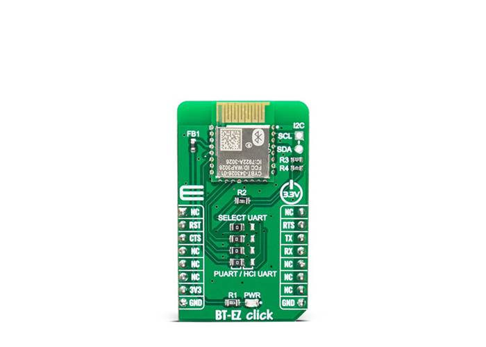The BT-EZ Click is fully integrated Bluetooth smart ready wireless module which includes an onboard crystal oscillator, passive components, flash memory, and the CYW20706 silicon device from Infineon. The CYBT-343026-01 module also includes Cortex-M3 32-bit processor and 512 KB of onboard serial flash memory and is designed for standalone operation, while the integrated power amplifier is used in order to achieve Class I or Class II output power capability. The BT-EZ Click board™ uses UART communication and GPIO pins for communication with the main MCU.
