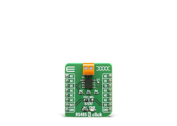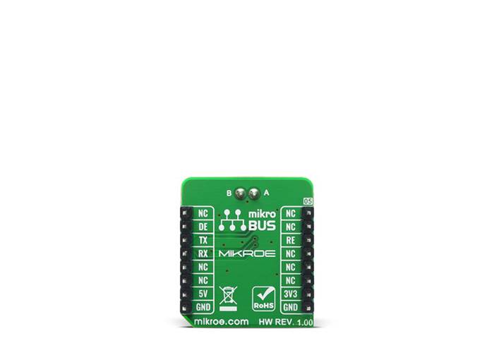 Since this device feature a wide common-mode voltage range which makes them suitable for multi-point applications over long cable runs. This Click board™ can be supplied and interfaced with both 3.3V and 5V without the need for any external components. The onboard SMD jumper labelled as VCC SEL allows voltage selection for interfacing with both 3.3V and 5V microcontrollers.