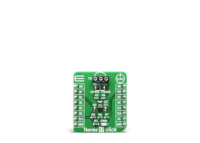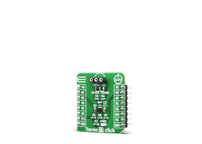 Thermo 17 Click is a Click board™ equipped with the TMP451-Q1 sensor IC, which can measure temperature measurements between -40°C and +125°C so that the temperature measurement data can be processed by the host MCU. The remote temperature sensors are typically low-cost discrete NPN or PNP transistors, or substrate thermal transistors or diodes that are integral parts of microprocessors, microcontrollers, or FPGAs.