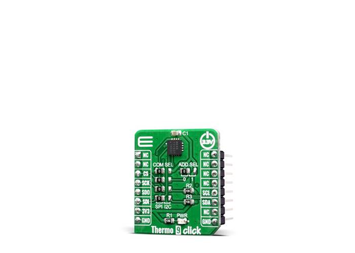 Thermo 9 Click is a Click board™ equipped with the TSYS01, a digital temperature sensor from TE Connectivity. Given its main features, the Thermo 9 Click, can be used for industrial control, replacement of thermistors and NTCs, heating/cooling systems, and HVAC.