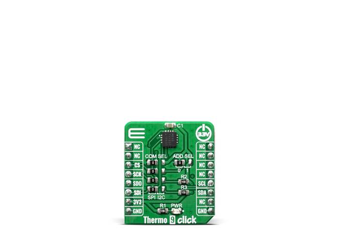 Given the most notable features of the Thermo 9 Click, it can be used for industrial control, replacement of thermistors and NTCs, heating/cooling systems, and HVAC. The design of the Click board™ itself is such that the thermal radiation from other components, which might affect the environmental temperature readings of the sensor, is reduced. The onboard SMD jumper labelled as VCC SEL allows voltage selection for interfacing with both 3.3V and 5V MCUs.