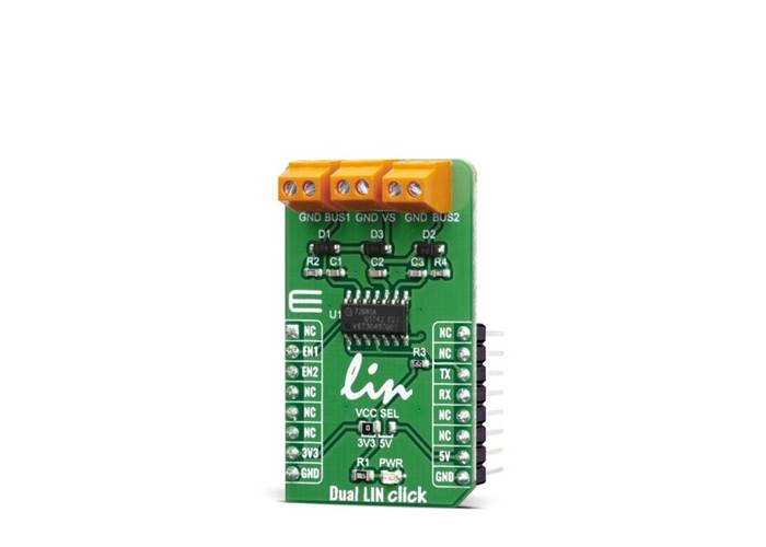 The Dual LIN Click supports different modes of operation of the two transceivers for minimising ECU current consumption in low power modes, a common INH output can be used for controlling external circuitry, for example voltage regulators. Based on the Infineon BiCMOS technology. It provides excellent ESD robustness together with very high electromagnetic compliance (EMC). The TLE7268SKXUMA1 reaches a very low level of electromagnetic emission (EME) within a broad frequency range and independent from the battery voltage. The TLE7268SKXUMA1 is AEC qualified and tailored to withstand the harsh conditions of the automotive environment.
