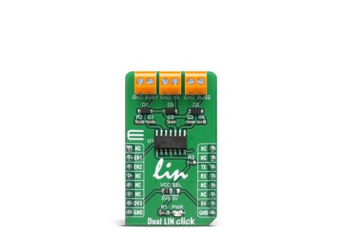 Given the features included in this transceiver, the Dual LIN Click can be used for Body Control Modules (BCM) and Gateway.