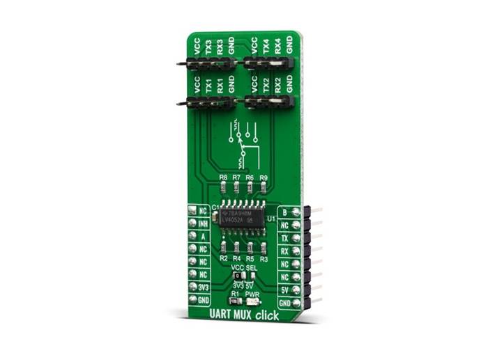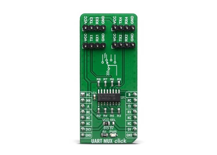 UART Mux Click offers a selection between 3.3V and 5V operation, with the onboard SMD jumper, labelled as PWR SEL. This allows both 3.3V and 5V MCUs to be interfaced with this Click board™.