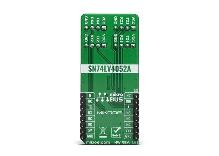 UART Mux Click is equipped with the SN74LV4052A, a Dual 4-Channel Multiplexer and Demultiplexer, from Texas Instruments. Two control pins are used to switch to one of four available outputs, from a single UART input, from the mikroBUS™. Control pins labelled as A and B, are routed to the mikroBUS™ and can be operated by both 3.3V and 5V MCUs. The quarter control pin is labelled as EN pin, and it is used to enable the internal multiplexing switches of the IC, when is set to a HIGH logic level (it is active HIGH). A and B pins are routed to CS and PWM pins of the mikroBUS™ respectively. The active low Inhibit (INH) tri-state all the channels when high and when low, depending on the A and B inputs, one of the four independent input/outputs is connected to the UART communication pins. INH pin is routed to the RST pin on the mikroBUS™.