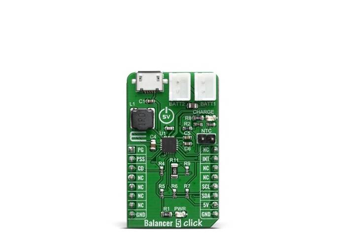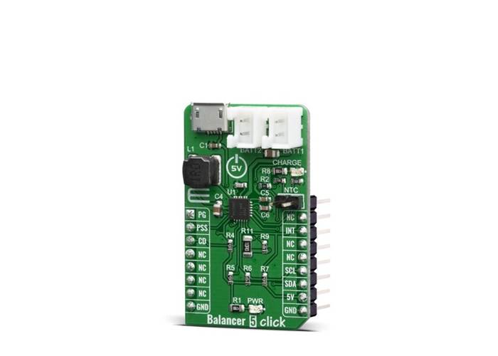 As a Lithium Ion batteries require a very accurate current and voltage for charging, Balancer 5 Click can be a perfect solution for such a task. Balancer 5 Click is equipped with a highly integrated Li-Ion battery charger, supporting intelligent, constant-current, constant voltage (CCCV), temperature-regulated battery charger charges a 2-cell lithium-ion (Li+) cell batteries. This Click has a charging current control IC over I2C interface which ensures perfect and efficient charging. Balancer 5 Click can be used as a part of the power supply and distribution system in many applications: different kinds of handheld appliances, portable media players, portable audio players, and other general-purpose battery-operated electronic devices.
